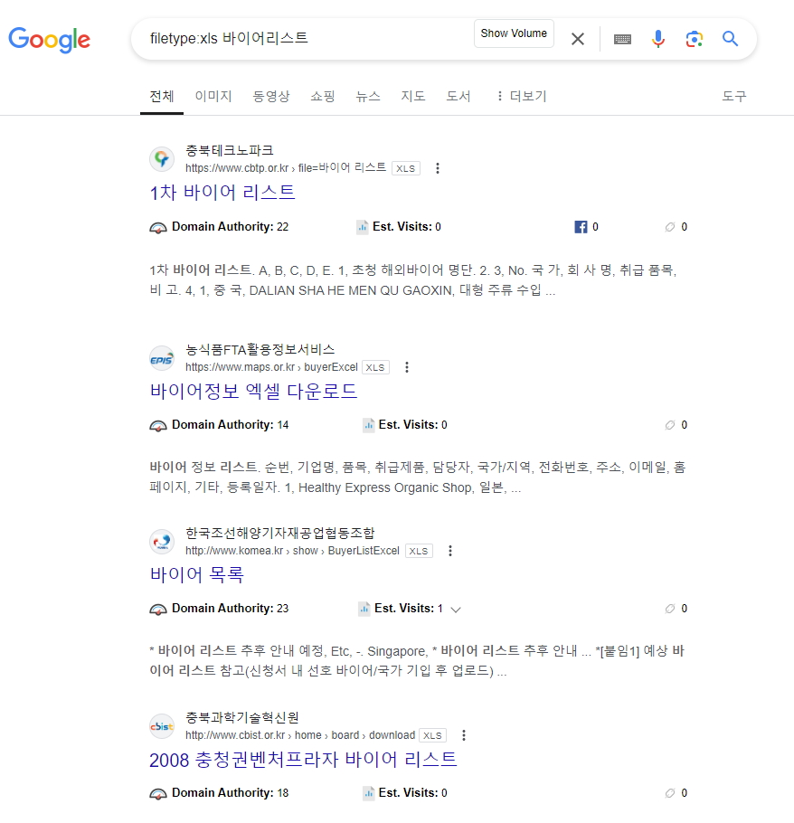 구글 검색을 통해 바이어리스트를 찾는 가장 기본적인 방법은 파일 형식을 지정하여 검색하는 것입니다.