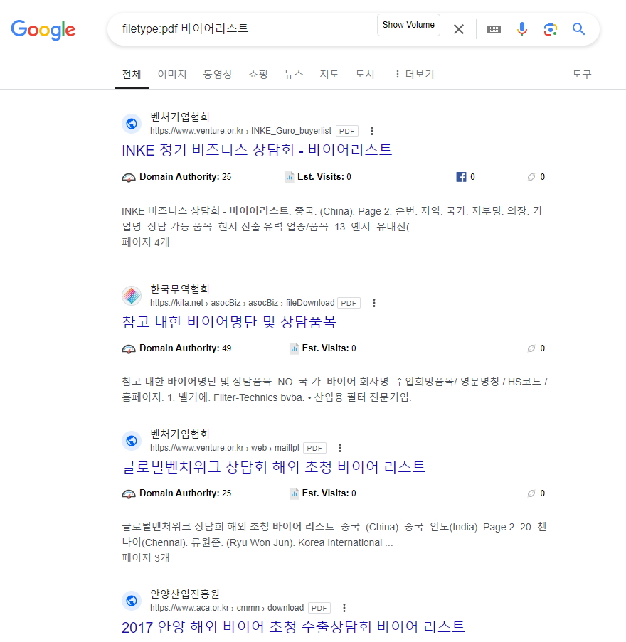 마찬가지로 "filetype:pdf 바이어리스트"라고 검색하면 PDF 형식의 바이어리스트가 검색됩니다.