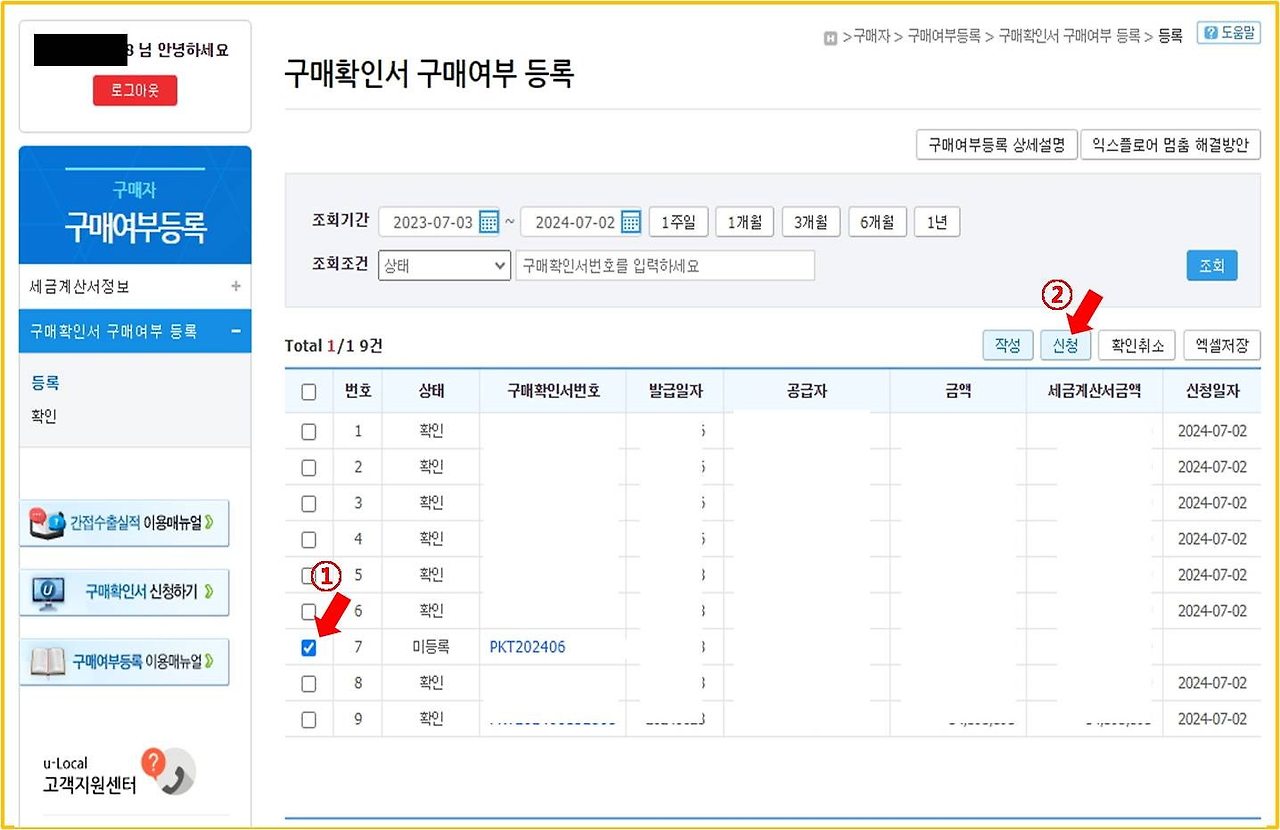 7. 구매확인서 구매여부 등록에서 등록으로 다시 나와서 조회기간설정하고 조회하면