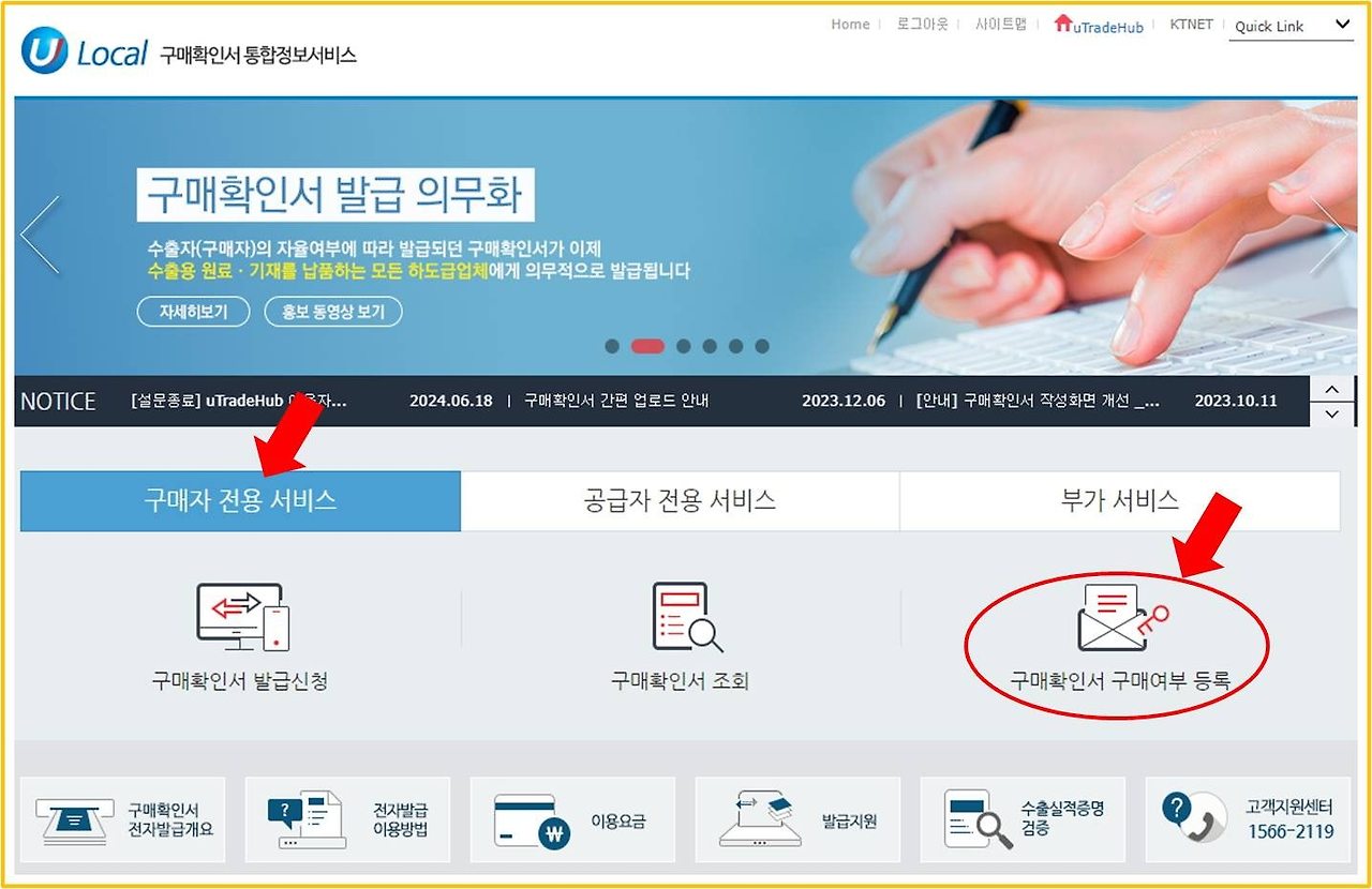 " 구매자 전용 서비스 " 를 클릭하고 " 구매확인서 구매여부 등록 "를 클릭합니다.