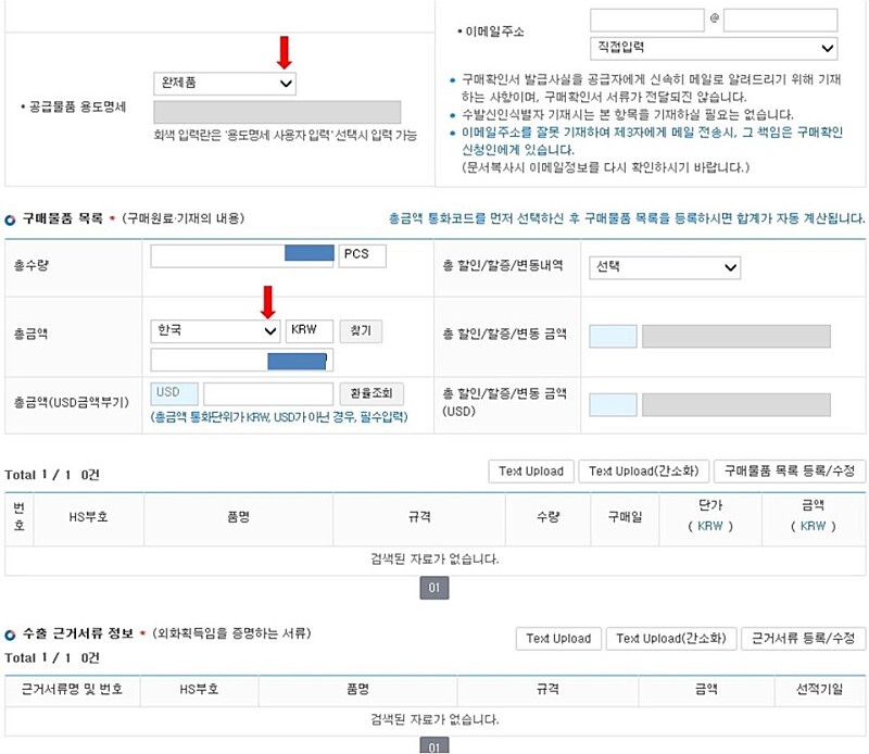 " 구매물품목록" 란에 수량과 총금액(원화)을 기입합니다.