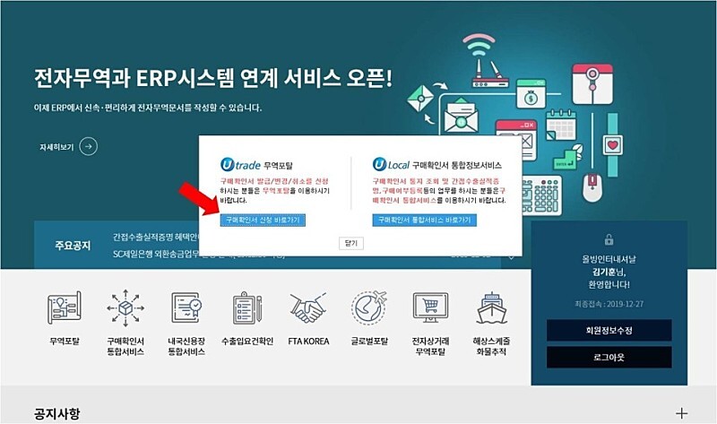 이런 화면이 뜨면 " 구매확인서 신청 바로가기 " 빨간색 화살표 방향을 클릭합니다.