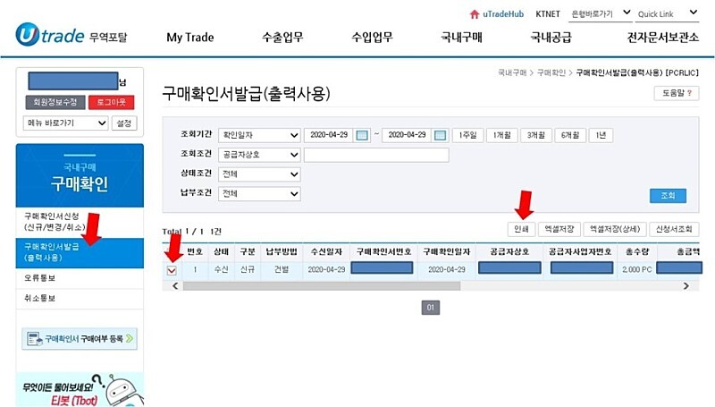 왼쪽 메뉴판에서 ①" 구매확인서발급(출력사용) "을 클릭하면 상단의 화면처럼 나옵니다.