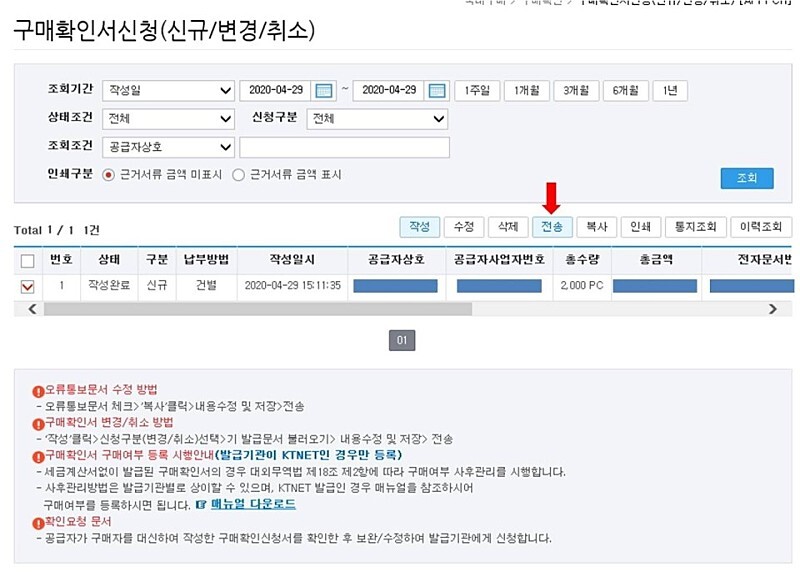 상단과 같은 화면이 뜨면 " 전송 "을 클릭하면 구매확인서 신청이 완료가 됩니다.