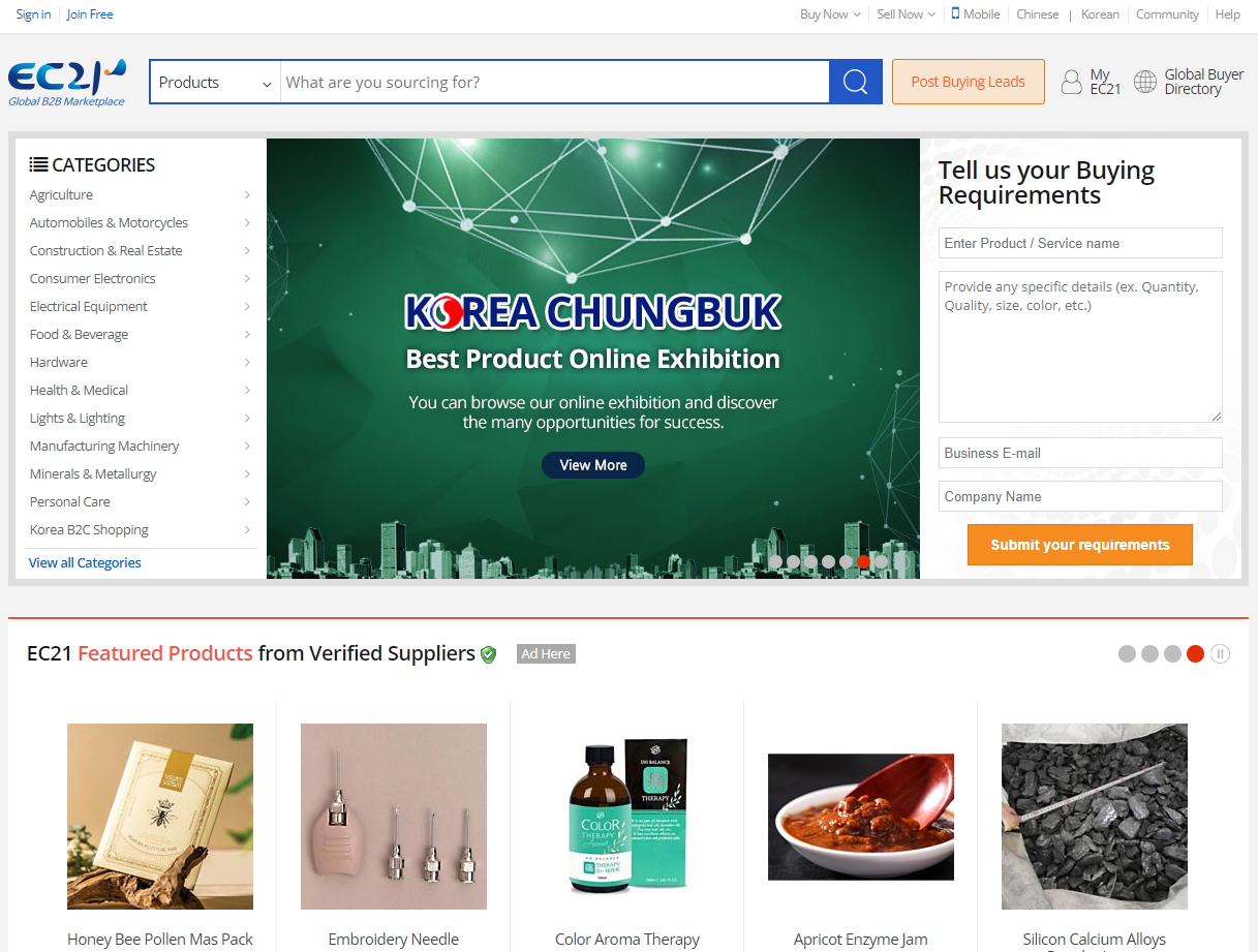 EC21은 대한민국 수출지원, 수출마케팅, 무역컨설팅 전문기업이며 2000년 경에 한국무역협회에서 분리되어 독자적인 운영하고 있는 한국 중소기업의 해외수출을 지원하고 있는 업체입니다. 주요 서비스로는 해외시장조사, 바이어발굴, 전시컨벤션, 홍보콘텐츠제작 등을 지원하고 있으며 무료 회원 가입이 가능합니다.
