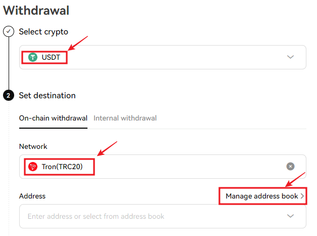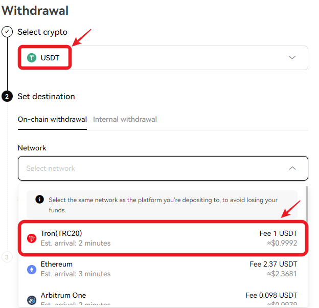 1. " Withdraw " 를 클릭하여 " Select crypto " 에 " USDT " 선택 및 네트워크 " Tron "을 선택합니다.