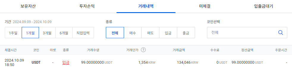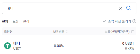 2. " 입출금 " 을 클릭하여 " 테더 "를 적습니다.
