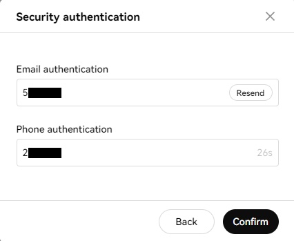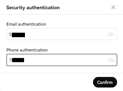 10. " Confirm" 를 클릭하게 되면 Security authentication에서 가입 시 적은 이메일과 핸드폰으로 발송된 숫자를 각각 기입합니다.
