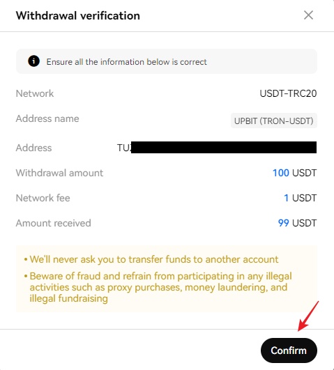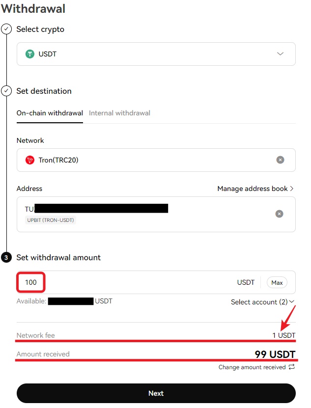 USDT 100 송금할 시에는 Network fee가 USDT 1이 차감되어 실제로 USDT 99를 받게 됩니다.