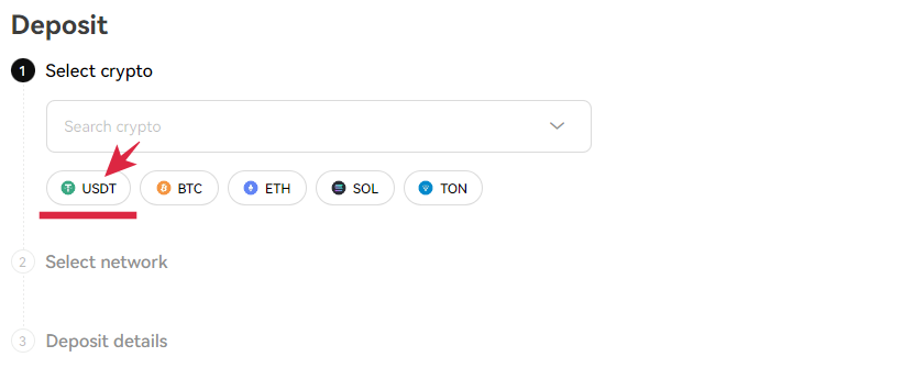 1. " Deposit " 를 클릭하여 " Select crypto " 에 " USDT " 선택합니다.