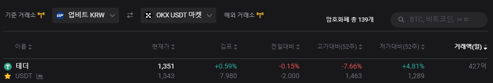 업비트 국내거래소 테더 (USDT)의 경우 해외 거래소 (OKX USDT) 보다 김프가 0.59% 더 높게 형성되어 있는 것을 알 수 있습니다.