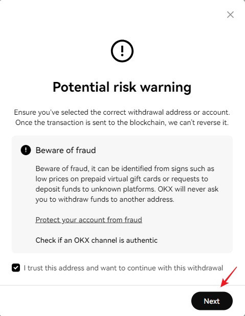 9. " Next "를 클릭하게 되면 Withdrawal verification (인출 증명)이 나옵니다. 입금주소를 제대로 확인하고...