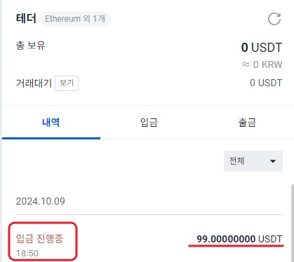 2024/ 10 / 9일 18시 48분에 USDT 99 인출되어 현재 Pending 상태라는 것을 보여줍니다.