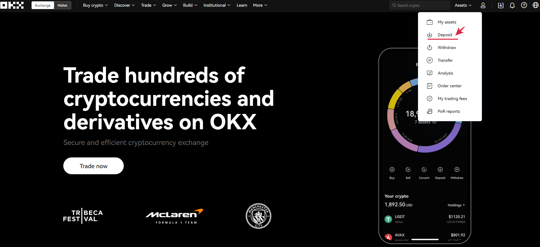 가입 후 OKX 웹사이트에 접속하여 오른쪽 상단에 " Assets " 커서를 갖다대서 " Deposit " 를 클릭합니다.