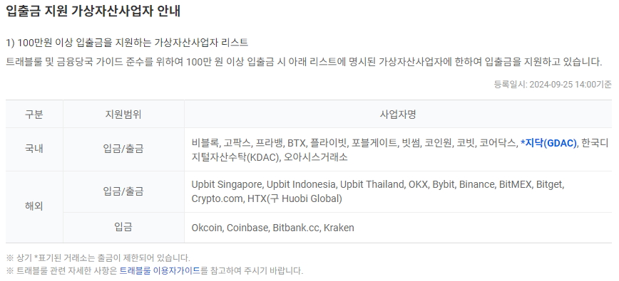 100만 이상의 입출금 건에 대하여 트래블 룰에 따라 업비트 (UPBIT) 거래소와 입출금이 자유로운 해외거래소를 선정해야 만 합니다.