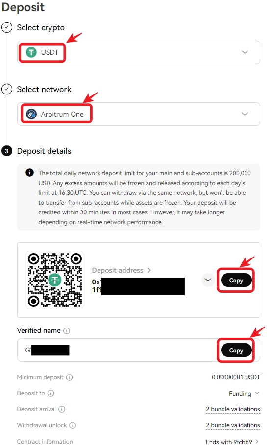 2. " USDT " 선택 한 후에 " Select network " 에서 " Arbitrum One " 을 선택합니다.