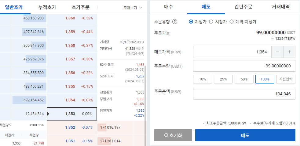 테더 (USDT)를 매도할 시에는 24시간 언제든지 매도할 수 있다는 장점이 있습니다.