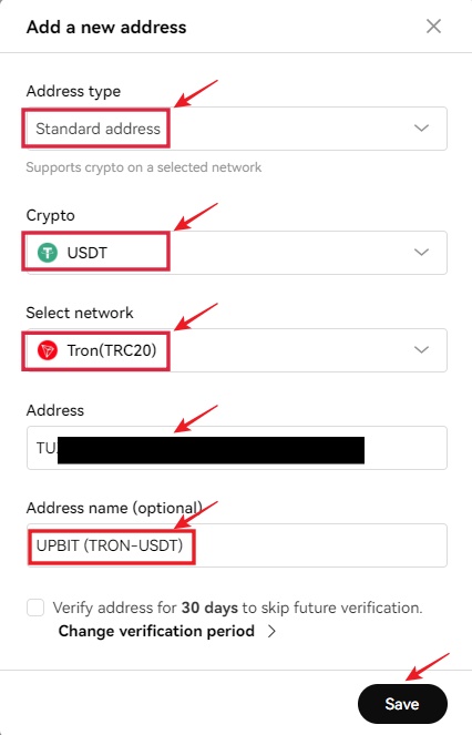 [ Address name ] UPBIT (TRON-USDT) : 본인이 알기 쉽게 적습니다.