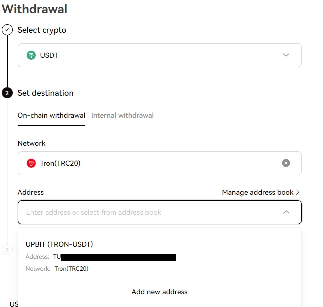 7. " Address " 에 " UPBIT (TRON-USDT) " 클릭 하고 Set withdrawal amount 란에 송금할 USDT 금액을 기입합니다.