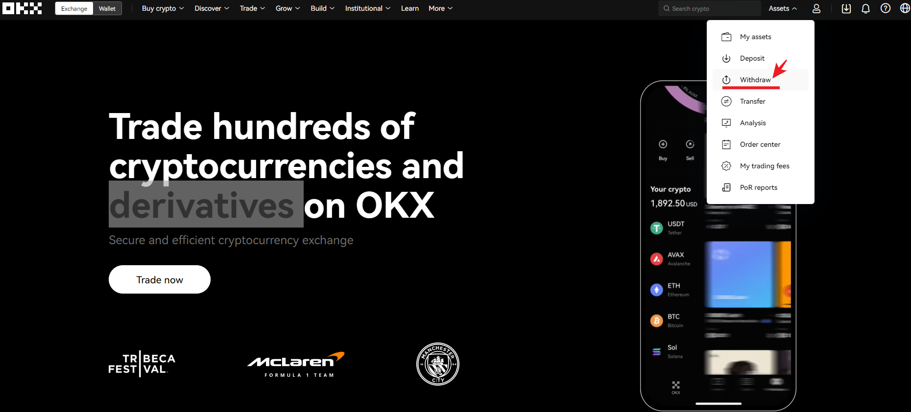 OKX 웹사이트에 접속하여 오른쪽 상단에 " Assets " 커서를 갖다대서 " Withdraw " 를 클릭합니다.