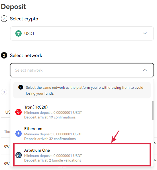 2. " USDT " 선택 한 후에 " Select network " 에서 " Arbitrum One " 을 선택합니다.