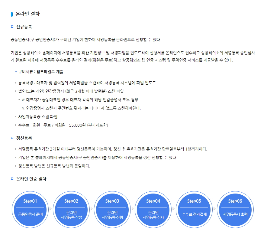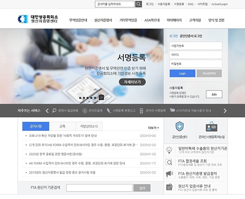 원산지 증명서를 발급 받기 전에 서명등록 및 공인인증서를 발급받아야 합니다. 가까운 대한상공회의소 지점에 방문하거나 온라인으로 등록을 합니다. 대한상공회의소 비회원은 서명등록비는 55,000원 과 공인인증서 발급비는 55,000원 비용이 듭니다. 각각 유효기간은 1년이며 1년이 지나기 전에 갱신해야 합니다.