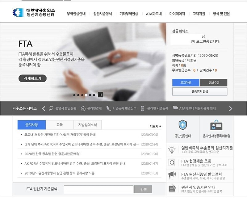 사이트 상단에 ' 원산지증명서 ' 란을 클릭합니다.