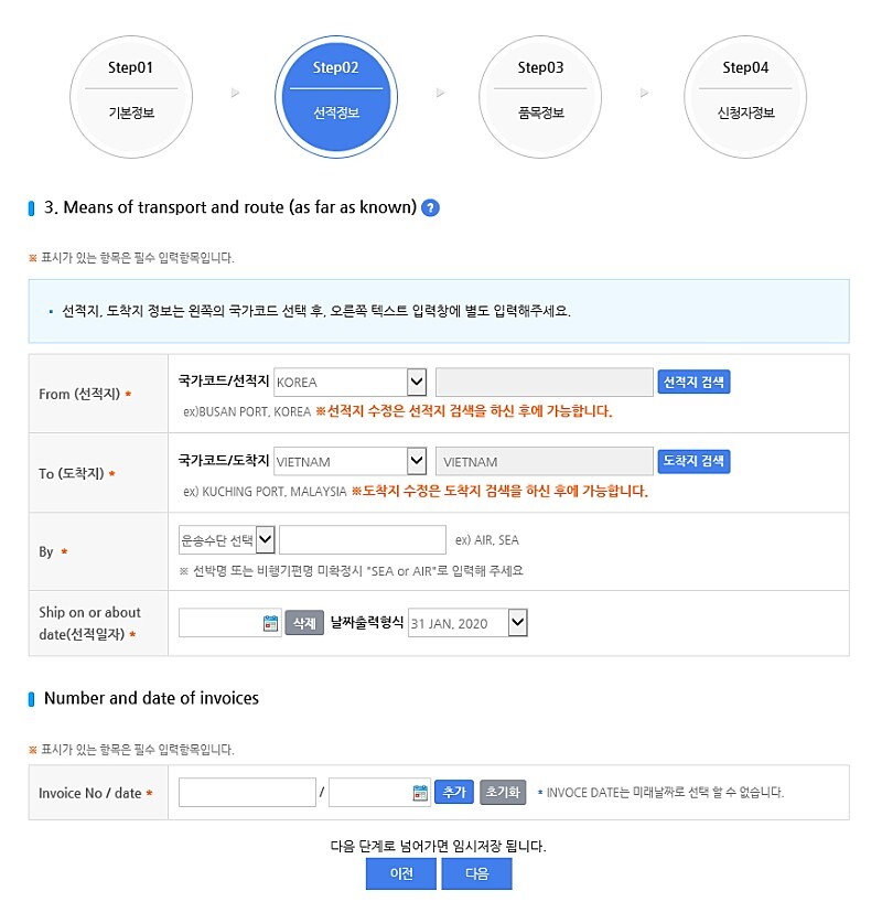 선적지, 도착지, 운송수단, 선적일자, 상업송장(Commercial Invoice)의 넘버 및 날짜를 정확하게 기입을 합니다.
