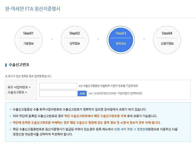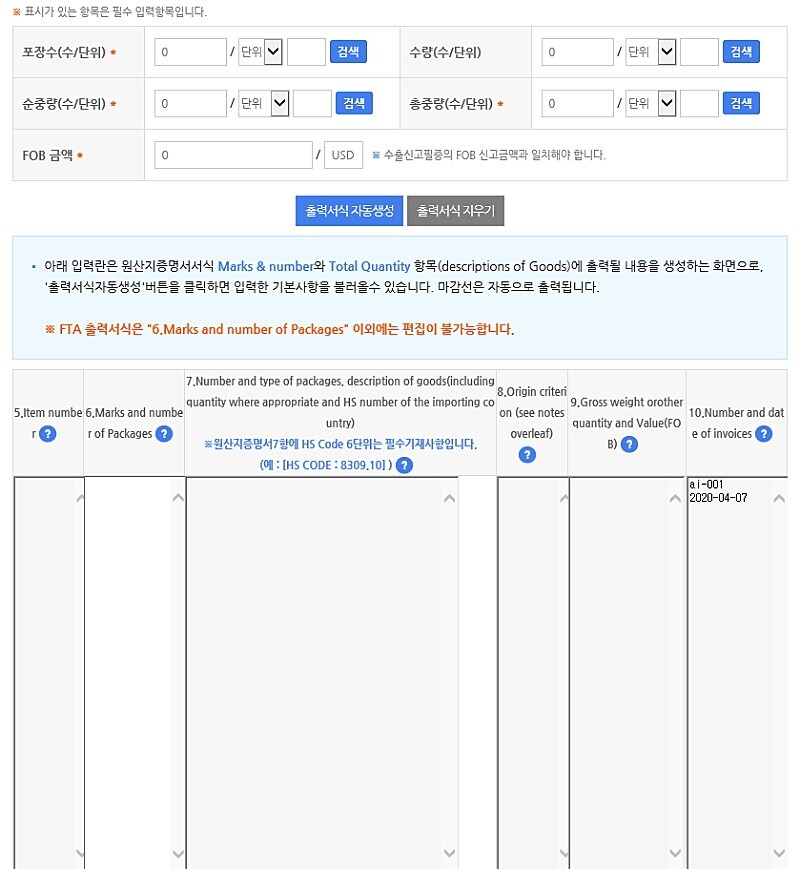 각 별표(*) 표시는 반드시 기입을 해야 하며 한-아세안 FTA 원산지 결정기준은 CC+SP로 하면 됩니다.