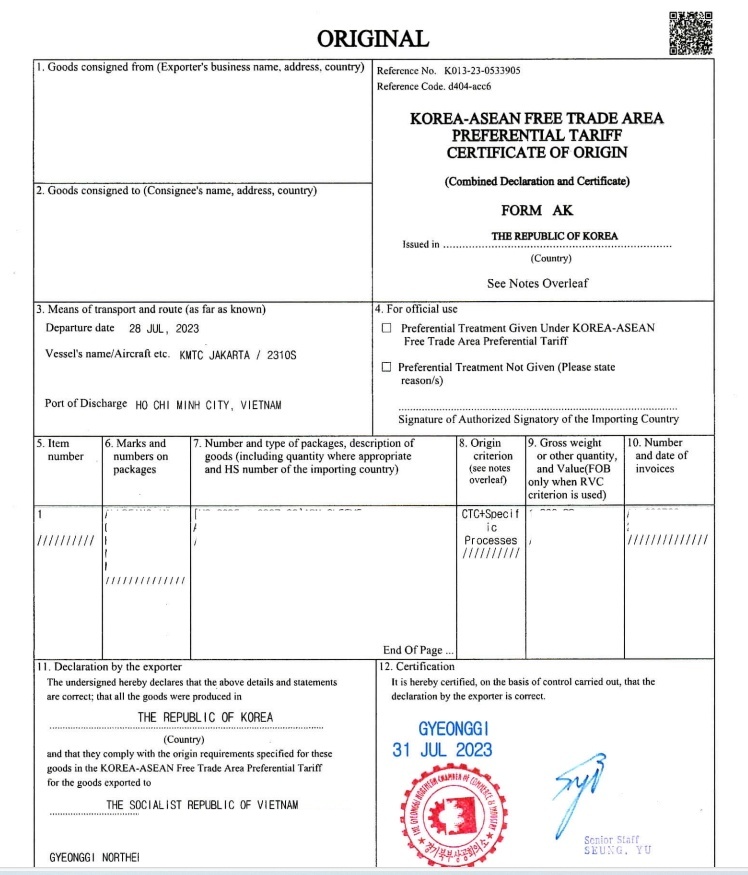 우리나라는 ASEAN(동남아국가연합)과 2005년 12월에 서명하여 한-아세안 FTA 경제협력 기본협정문을 의거하여 현재까지 FTA을 진행하고 있습니다. ASEAN (아세안) 국가들은 브루나이, 캄보디아, 인도네시아, 라오스, 말레이시아, 미얀마, 필리핀, 싱가포르, 베트남, 태국 총 10개국을 포함하고 있으며 이들 국가들과 수출입을 통해 관세혜택을 받기 위해 동남아 바이어들이 한-아세안 FTA원산지증명서(Form AK)를 요청하고 있는 실정입니다.